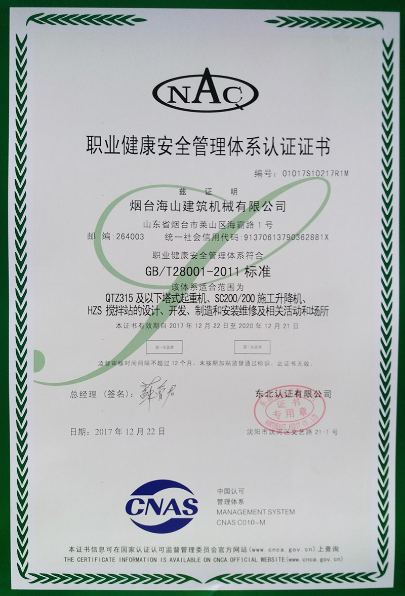 職業(yè)健康安全管理體系認(rèn)證證書